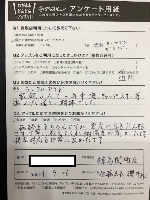 お車:ランドクルーザープラド Q.愛車との思い出は? A.家族3人で一年中海、キャンプ、スキー等遊んだ逞しい相棒でした。 Q.アップルの感想は? A.価格はもちろんですが、査定内容も包み隠さず丁寧に教えてくれ納得度が高かったです。接客対応も非常に良かったです。
