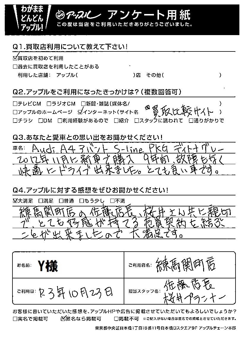 お車:アウディA4アバント Q.愛車との思い出は? A.2012年11月に新車で購入、9年間故障もなく快適にドライブ出来ました。とても良い車です。 Q.アップルの感想は? A.練馬関町店の佐藤店長、櫻井さん共に親切で、とても好感が持てる売買契約を結ぶことが出来ましたので大満足です。