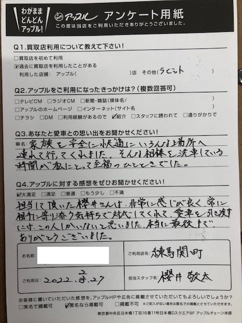 お車:トヨタアルファード Q.愛車との思い出は? A.家族を安全に快適にいろんな場所へ連れて行ってくれました。そ んな相棒を洗車している時間が私にとって至福のひとときでした。Q.アップルの感想は? A.大満足:担当して頂いた櫻井さんは非常に感じが良く、常に相手に寄り添う気持ちで対応してくれて、愛車を引き渡すには、この人しかないと思いました。本当に最後までありがとうございました。