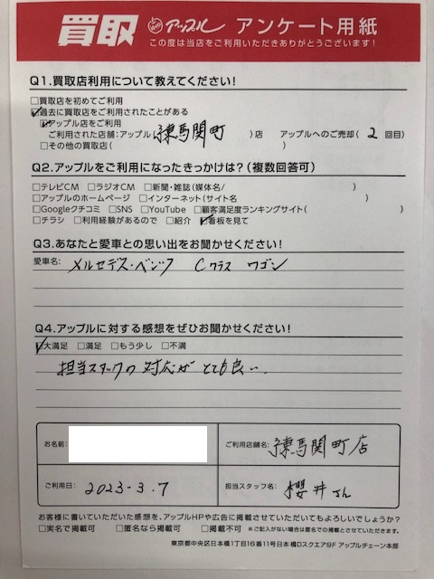 お車のご相談・ 査定だけでもOK! カンタン 入力 30秒 アップルがブランド買取始めました! お電話でも受付中! 受付時間10:00 ~ 19:00 03-5903-8567 お車のご相談・ 査定だけでもOK! カンタン 入力 30秒 アップルがブランド買取始めました! お電話でも受付中! 受付時間10:00 ~ 19:00 03-5903-8567 アップルがブランド買取始めました! お電話でも受付中! 受付時間10:00 ~ 19:00 03-5903-8567 店舗情報 在庫車 スタッフ紹介 ブログ お客様の声 キャンペーン お得 無料査定 click お客様の声 ご記入日: 2023/03/07 東京都三鷹市 K・T様 車名:メルセデス・ベンツ Cクラスワゴン お車:メルセデス・ベンツ Cクラスワゴン Q.アップルの感想は? A.大満足:担当スタッフの対応が、とても良い 前へ 次へ お客様の声一覧を見る