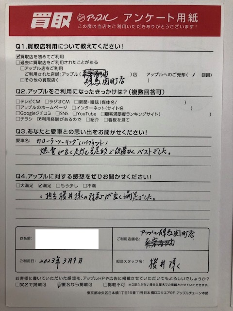 お車のご相談・ 査定だけでもOK! カンタン 入力 30秒 アップルがブランド買取始めました! お電話でも受付中! 受付時間10:00 ~ 19:00 03-5903-8567 お車のご相談・ 査定だけでもOK! カンタン 入力 30秒 アップルがブランド買取始めました! お電話でも受付中! 受付時間10:00 ~ 19:00 03-5903-8567 アップルがブランド買取始めました! お電話でも受付中! 受付時間10:00 ~ 19:00 03-5903-8567 店舗情報 在庫車 スタッフ紹介 ブログ お客様の声 キャンペーン お得 無料査定 click お客様の声 ご記入日: 2023/03/09 東京都練馬区 S・R様 車名:トヨタ カローラツーリング お車:カローラツーリングハイブリッド Q.愛車との思い出は? 燃費が良く走行も安定的で故障なくベストでした。Q.アップルの感想は? A.満足:担当桜井様の対応が良く満足でした。 前へ 次へ お客様の声一覧を見る