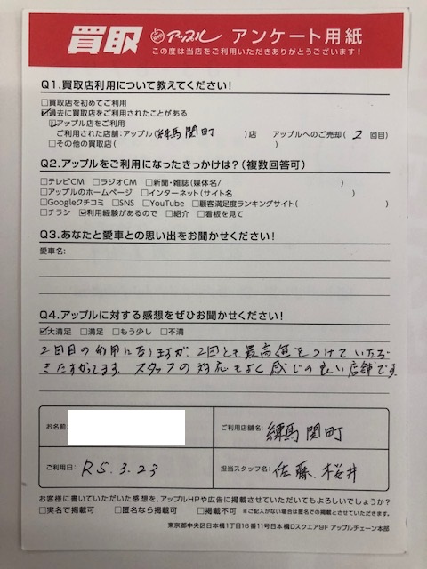 お車のご相談・ 査定だけでもOK! カンタン 入力 30秒 アップルがブランド買取始めました! お電話でも受付中! 受付時間10:00 ~ 19:00 03-5903-8567 お車のご相談・ 査定だけでもOK! カンタン 入力 30秒 アップルがブランド買取始めました! お電話でも受付中! 受付時間10:00 ~ 19:00 03-5903-8567 アップルがブランド買取始めました! お電話でも受付中! 受付時間10:00 ~ 19:00 03-5903-8567 店舗情報 在庫車 スタッフ紹介 ブログ お客様の声 キャンペーン お得 無料査定 click お客様の声 ご記入日: 2023/03/23 東京都中野区 K・Y様 車名:トヨタ エスティマ お車:エスティマ Q.アップルの感想は? A.大満足:2回目の利用になりますが、2回とも最高値をつけていただきたすかってます。スタッフの対応もよく感じの良い店舗です。 前へ 次へ お客様の声一覧を見る