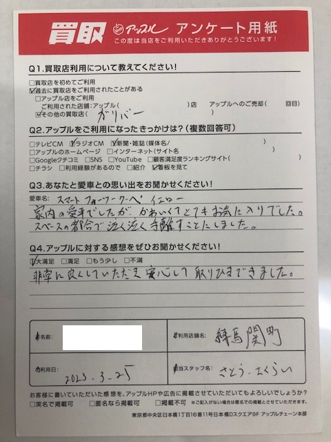お車のご相談・ 査定だけでもOK! カンタン 入力 30秒 アップルがブランド買取始めました! お電話でも受付中! 受付時間10:00 ~ 19:00 03-5903-8567 お車のご相談・ 査定だけでもOK! カンタン 入力 30秒 アップルがブランド買取始めました! お電話でも受付中! 受付時間10:00 ~ 19:00 03-5903-8567 アップルがブランド買取始めました! お電話でも受付中! 受付時間10:00 ~ 19:00 03-5903-8567 店舗情報 在庫車 スタッフ紹介 ブログ お客様の声 キャンペーン お得 無料査定 click お客様の声 ご記入日: 2023/03/25 東京都杉並区 M・H様 車名:スマート フォーツークーペ お車:スマートフォーツークーペ イエローQ.愛車との思い出は? 家内の愛車でしたが、かわいくてとてもお気に入りでした。スペースの都合で泣く泣く手離すことにしました。Q.アップルの感想は? A.大満足:非常に良くしていただき安心して取りひきできました。 前へ 次へ お客様の声一覧を見る