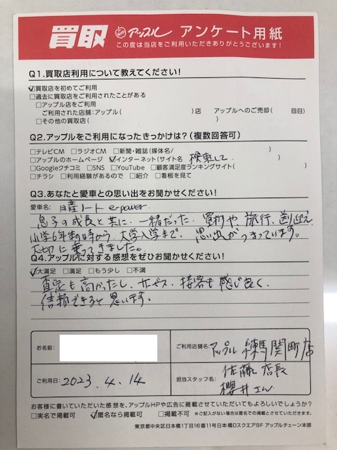 お車:日産ノートe-powerQ.愛車との思い出は? 息子の成長と共に一緒だった。買物や旅行、送り迎え小学6年生の時から大学入学まで、思い出がつまっています。大切に乗ってきました。Q.アップルの感想は? A.大満足:査定も高かったし、サービス、接客も感じ良く、信頼できると思います。