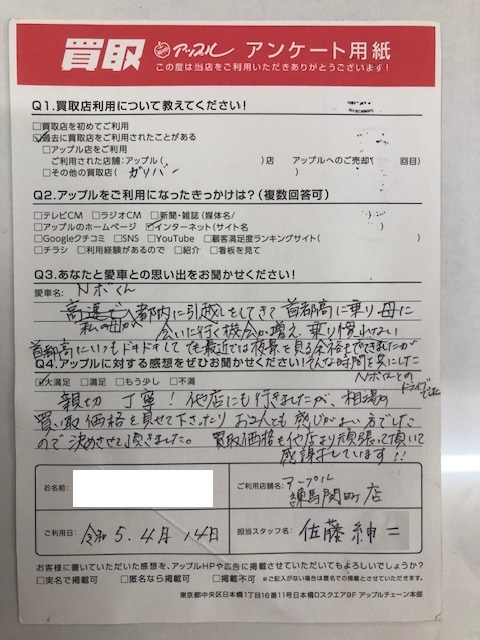 お車:NボくんQ.愛車との思い出は? 都内に引越しをしてきて首都高に乗り母に会いに行く機会が増え、乗り慣れない首都高にいつもドキドキして、でも最近では夜景を見る余裕もでてきましたがそんな時間を共にしたNボくんとのドライブでした。Q.アップルの感想は? A.大満足:親切丁寧!他店にも行きましたが、相場の買い取価格を見せて下さったりお2人とも感じがよい方でしたので決めさせて頂きました。買取価格も他店より頑張って頂いて感謝しています!!