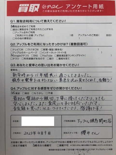 お車:ワゴンRQ.愛車との思い出は? 新卒時から11年間共に過ごしてきました。徒歩や電車では行けない景色を沢山見せてくれて有難う!Q.アップルの感想は? A.大満足:最初の電話から親切、丁寧に接してくださり、とても安心しました。また査定にもすぐ対応いただき、査定額も思った以上つけてくださり、感謝です!