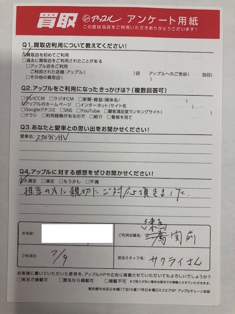 お車のご相談・ 査定だけでもOK! カンタン 入力 30秒 アップルがブランド買取始めました! お電話でも受付中! 受付時間10:00 ~ 19:00 03-5903-8567 お車のご相談・ 査定だけでもOK! カンタン 入力 30秒 アップルがブランド買取始めました! お電話でも受付中! 受付時間10:00 ~ 19:00 03-5903-8567 アップルがブランド買取始めました! お電話でも受付中! 受付時間10:00 ~ 19:00 03-5903-8567 店舗情報 在庫車 スタッフ紹介 ブログ お客様の声 キャンペーン お得 無料査定 click お客様の声 ご記入日: 2023/07/09 東京都武蔵野市 K・N様 車名:日産 スカイライン(セダン) お車:スカイラインHVQ.アップルの感想は? A.大満足:担当の方に親切にご対応頂きました。 前へ 次へ お客様の声一覧を見る