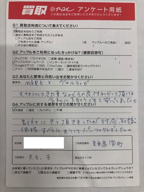 お車のご相談・ 査定だけでもOK! カンタン 入力 30秒 アップルがブランド買取始めました! お電話でも受付中! 受付時間10:00 ~ 19:00 03-5903-8567 お車のご相談・ 査定だけでもOK! カンタン 入力 30秒 アップルがブランド買取始めました! お電話でも受付中! 受付時間10:00 ~ 19:00 03-5903-8567 アップルがブランド買取始めました! お電話でも受付中! 受付時間10:00 ~ 19:00 03-5903-8567 店舗情報 在庫車 スタッフ紹介 ブログ お客様の声 キャンペーン お得 無料査定 click お客様の声 ご記入日: 2023/03/25 東京都武蔵野市 M・T様 車名:トヨタ マークX お車:マークXヴェルティガQ.愛車との思い出は?大切にしてきた車なのでその良さをわかって頂ける会社に下取りできて安心しました。Q.アップルの感想は? A.大満足:数社に来て頂きましたが対応、知識、価格すべてにおいてパーフェクトでした。 前へ 次へ お客様の声一覧を見る