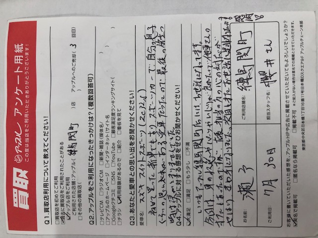 お車:スイフトスポーツ(ZC32S)Q.愛車との思い出は?初めて買った新車でもあり、スポーツカーで自分の息子ぐらいの思い入れがある愛車だったので、最後の旅立つ時は涙がとまりませんでした。Q.アップルの感想は? A.大満足:いつもアップル練馬関町店には、お世話になってます。今回は車のパーツやいじりが良かったので他社さんのオファーもあったのですが、店長、担当の方の心の対応がやはりきめ手になりました。次回もまたお世話に是非なりたいです。感謝!
