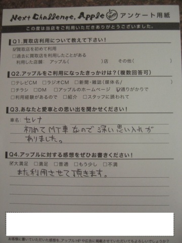 お車のご相談・ 査定だけでもOK! カンタン 入力 30秒 アップルがブランド買取始めました! お電話でも受付中! 受付時間10:00 ~ 19:00 03-5903-8567 お車のご相談・ 査定だけでもOK! カンタン 入力 30秒 アップルがブランド買取始めました! お電話でも受付中! 受付時間10:00 ~ 19:00 03-5903-8567 アップルがブランド買取始めました! お電話でも受付中! 受付時間10:00 ~ 19:00 03-5903-8567 店舗情報 在庫車 スタッフ紹介 ブログ お客様の声 キャンペーン お得 無料査定 click お客様の声 ご記入日: 2015/01/31 M・T様 お車:セレナQ.愛車との思い出は? A.初めてMT車なので深い思い入れがありました。Q.アップルの感想は? A.大満足。また利用させて頂きます。 前へ 次へ お客様の声一覧を見る