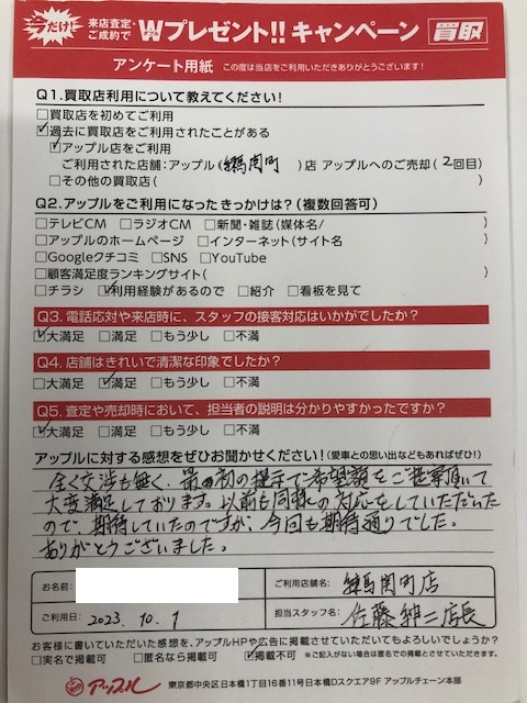 お車:フリードHVQ.アップルに対する感想は? A.大満足:全く交渉も無く、最初の提示で希望額をご提示頂いて大変満足しております。以前も同様の対応をしていただいたので、期待していたのですが、今回も期待通りでした。ありがとうございました。