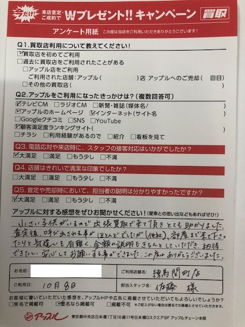 お車:デミオQ.アップルに対する感想は? A.大満足:小さい子供がいるので出張査定で来て頂きとても助かりました。査定後、呼び出される事がほとんどでしたが(他社)、部屋まで来て下さったりと気遣いも有難く、金額の説明もきちんとしていただき、納得できたし、安心してお願いする事ができました。この度はありがとうございました。