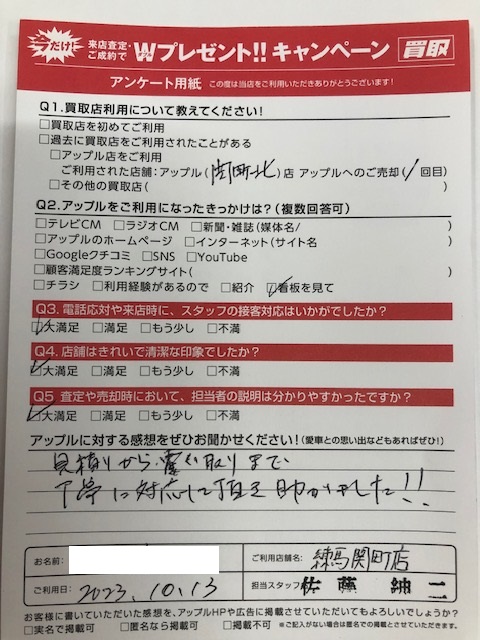 お車のご相談・ 査定だけでもOK! カンタン 入力 30秒 アップルがブランド買取始めました! お電話でも受付中! 受付時間10:00 ~ 19:00 03-5903-8567 お車のご相談・ 査定だけでもOK! カンタン 入力 30秒 アップルがブランド買取始めました! お電話でも受付中! 受付時間10:00 ~ 19:00 03-5903-8567 アップルがブランド買取始めました! お電話でも受付中! 受付時間10:00 ~ 19:00 03-5903-8567 店舗情報 在庫車 スタッフ紹介 ブログ お客様の声 キャンペーン お得 無料査定 click お客様の声 ご記入日: 2023/10/08 東京都練馬区 H・R様 車名:トヨタ カローラフィールダー フィールダー(カローラ) お車:カローラフィルダーQ.アップルに対する感想は? A.大満足:見積りから、買い取りまで丁寧に対応して頂き助かりました!! 前へ 次へ お客様の声一覧を見る