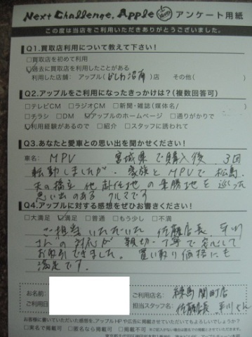 お車のご相談・ 査定だけでもOK! カンタン 入力 30秒 アップルがブランド買取始めました! お電話でも受付中! 受付時間10:00 ~ 19:00 03-5903-8567 お車のご相談・ 査定だけでもOK! カンタン 入力 30秒 アップルがブランド買取始めました! お電話でも受付中! 受付時間10:00 ~ 19:00 03-5903-8567 アップルがブランド買取始めました! お電話でも受付中! 受付時間10:00 ~ 19:00 03-5903-8567 店舗情報 在庫車 スタッフ紹介 ブログ お客様の声 キャンペーン お得 無料査定 click お客様の声 ご記入日: 2015/02/01 S・S様 お車:MPVQ.愛車との思い出は? A.宮城県で購入後、3回転勤しましたが、家族とMPVで松島、天橋立他、赴任地の景勝地を巡った思い出のあるクルマです。Q.アップルの感想は? A.ご担当頂いた佐藤店長、平川さんの対応が親切丁寧で安心してお取引出来ました。買取価格にも満足です。 前へ 次へ お客様の声一覧を見る