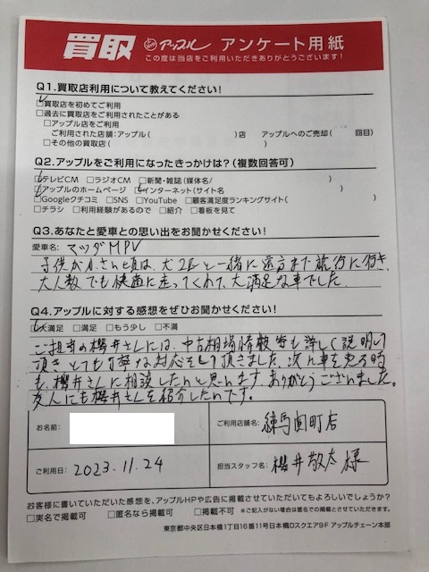 お車:MPV Q.愛車との思い出は?子供が小さい頃は犬2匹と一緒に遠方まで旅行に行き、大人数でも快適に走ってくれて、大満足な車でした。Q.アップルの感想は? A.大満足:ご担当の櫻井さんには中古相場情報等も詳しく説明して頂きとても丁寧な対応をして頂きました。次に車を売る時も櫻井さんに相談したいと思います。ありがとうございました。友人にも櫻井さんを紹介したいです。
