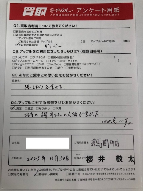 お車のご相談・ 査定だけでもOK! カンタン 入力 30秒 アップルがブランド買取始めました! お電話でも受付中! 受付時間10:00 ~ 19:00 03-5903-8567 お車のご相談・ 査定だけでもOK! カンタン 入力 30秒 アップルがブランド買取始めました! お電話でも受付中! 受付時間10:00 ~ 19:00 03-5903-8567 アップルがブランド買取始めました! お電話でも受付中! 受付時間10:00 ~ 19:00 03-5903-8567 店舗情報 在庫車 スタッフ紹介 ブログ お客様の声 キャンペーン お得 無料査定 click お客様の声 ご記入日: 2023/11/30 東京都練馬区 O・K様 車名:日産 エルグランド お車:エルグランド Q.愛車との思い出は?孫を乗せた。Q.アップルの感想は? A.大満足:担当の櫻井さんの人柄が良かった。100点です。 前へ 次へ お客様の声一覧を見る