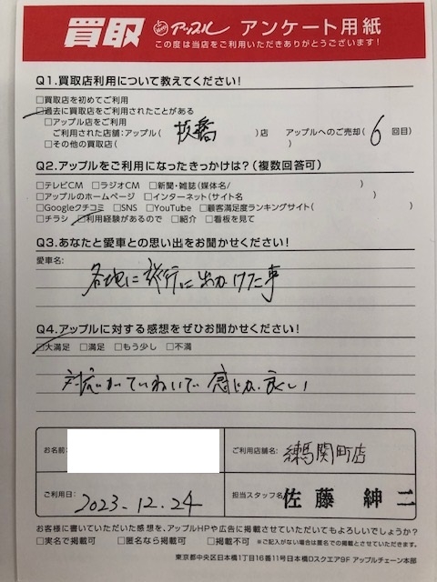 お車のご相談・ 査定だけでもOK! カンタン 入力 30秒 アップルがブランド買取始めました! お電話でも受付中! 受付時間10:00 ~ 19:00 03-5903-8567 お車のご相談・ 査定だけでもOK! カンタン 入力 30秒 アップルがブランド買取始めました! お電話でも受付中! 受付時間10:00 ~ 19:00 03-5903-8567 アップルがブランド買取始めました! お電話でも受付中! 受付時間10:00 ~ 19:00 03-5903-8567 店舗情報 在庫車 スタッフ紹介 ブログ お客様の声 キャンペーン お得 無料査定 click お客様の声 ご記入日: 2023/12/24 東京都練馬区 K・T様 車名:BMW 1シリーズ お車:BMW1シリーズ Q.愛車との思い出は?各地に旅行に出かけた事Q.アップルの感想は? A.大満足:対応がていねいで感じが良い 前へ 次へ お客様の声一覧を見る