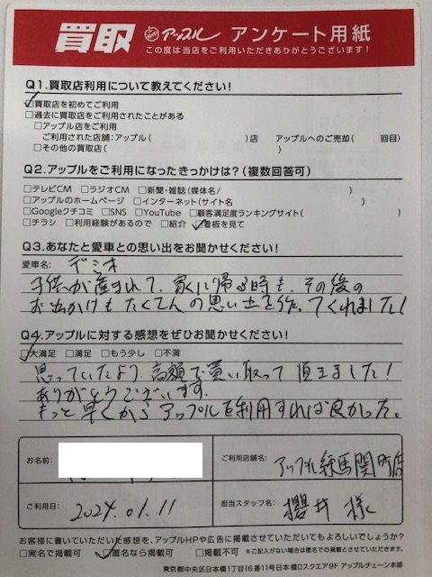 お車のご相談・ 査定だけでもOK! カンタン 入力 30秒 アップルがブランド買取始めました! お電話でも受付中! 受付時間10:00 ~ 19:00 03-5903-8567 お車のご相談・ 査定だけでもOK! カンタン 入力 30秒 アップルがブランド買取始めました! お電話でも受付中! 受付時間10:00 ~ 19:00 03-5903-8567 アップルがブランド買取始めました! お電話でも受付中! 受付時間10:00 ~ 19:00 03-5903-8567 店舗情報 在庫車 スタッフ紹介 ブログ お客様の声 キャンペーン お得 無料査定 click お客様の声 ご記入日: 2024/01/11 東京都練馬区 S・H様 車名:マツダ デミオ お車:デミオ Q.愛車との思い出は?子供が産まれて、家に帰る時もその後のお出かけもたくさんの思い出を作ってくれました。 Q.アップルの感想は?A.大満足:思っていたより高額で買い取って頂きました!ありがとうございます。もっと早くからアップルを利用すれば良かった。 前へ 次へ お客様の声一覧を見る