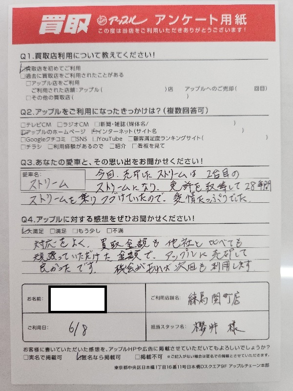 三鷹市 S・H様 車名:ホンダ ストリーム