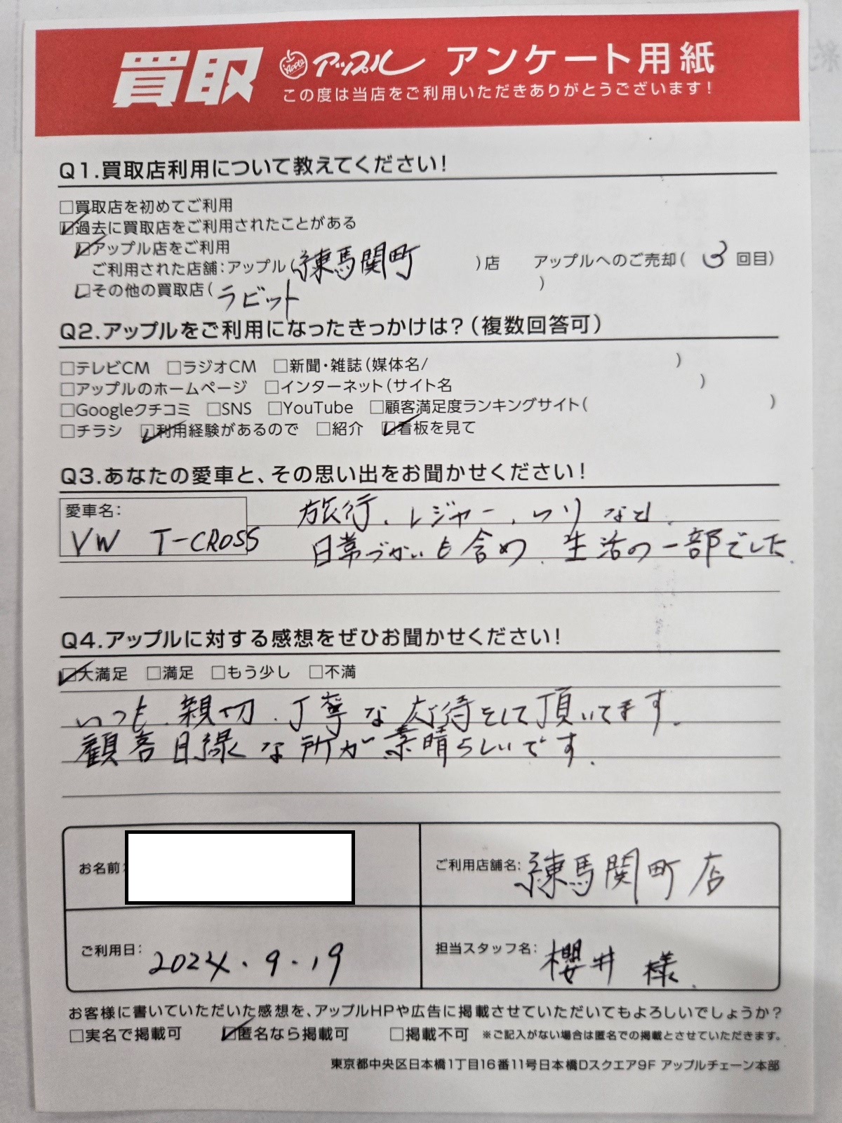 お車のご相談・ 査定だけでもOK! カンタン 入力 30秒 アップルがブランド買取始めました! お電話でも受付中! 受付時間10:00 ~ 19:00 03-5903-8567 お車のご相談・ 査定だけでもOK! カンタン 入力 30秒 アップルがブランド買取始めました! お電話でも受付中! 受付時間10:00 ~ 19:00 03-5903-8567 アップルがブランド買取始めました! お電話でも受付中! 受付時間10:00 ~ 19:00 03-5903-8567 店舗情報 在庫車 スタッフ紹介 ブログ お客様の声 キャンペーン お得 無料査定 click お客様の声 ご記入日: 2024/09/19 三鷹市 K・T様 車名:フォルクスワーゲン T-Cross お車:VW T-CROSS Q.愛車との思い出は?旅行、レジャー、つりなど日常づかいも含め、生活の一部でした。 Q.アップルの感想は?A.大満足:いつも親切丁寧な応待をして頂いてます。顧客目線な所が素晴らしいです。 前へ 次へ お客様の声一覧を見る
