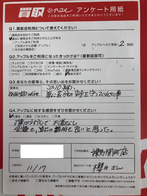 お車のご相談・ 査定だけでもOK! カンタン 入力 30秒 アップルがブランド買取始めました! お電話でも受付中! 受付時間10:00 ~ 19:00 03-5903-8567 お車のご相談・ 査定だけでもOK! カンタン 入力 30秒 アップルがブランド買取始めました! お電話でも受付中! 受付時間10:00 ~ 19:00 03-5903-8567 アップルがブランド買取始めました! お電話でも受付中! 受付時間10:00 ~ 19:00 03-5903-8567 店舗情報 在庫車 スタッフ紹介 ブログ お客様の声 キャンペーン お得 無料査定 click お客様の声 ご記入日: 2024/11/17 練馬区 S・A様 車名:BMW 4シリーズグランクーペ お車:BMW420 xDRIVE Q.愛車との思い出は?10年間、常に家族の安全を守ってくれた車 Q.アップルの感想は?A.大満足:丁寧な対応で不満なし、金額も算出の説明も良いと思った 前へ 次へ お客様の声一覧を見る
