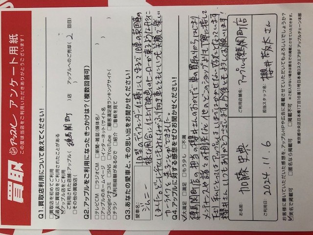 お車:ジムニー Q.愛車との思い出は?旧型のディフェンダー仕様にしてまるで旧車の英国車の様な風合に仕上げ映画のヒーローが来るような形にしました。どこに行くにもみんながふり向き車とともにいつも笑顔で楽しいカーライフを送ることができました。 Q.アップルの感想は?A.大満足:練馬関町店の担当の櫻井さんのおかげで車の買取りからはじまりメンテナンスや諸々の相談など他のどこのショップよりも丁寧に接して下さり私にとってはアップルはいまではかかせない存在となっています。櫻井さんいつもありがとうございます。今後ともよろしくお願いします。
