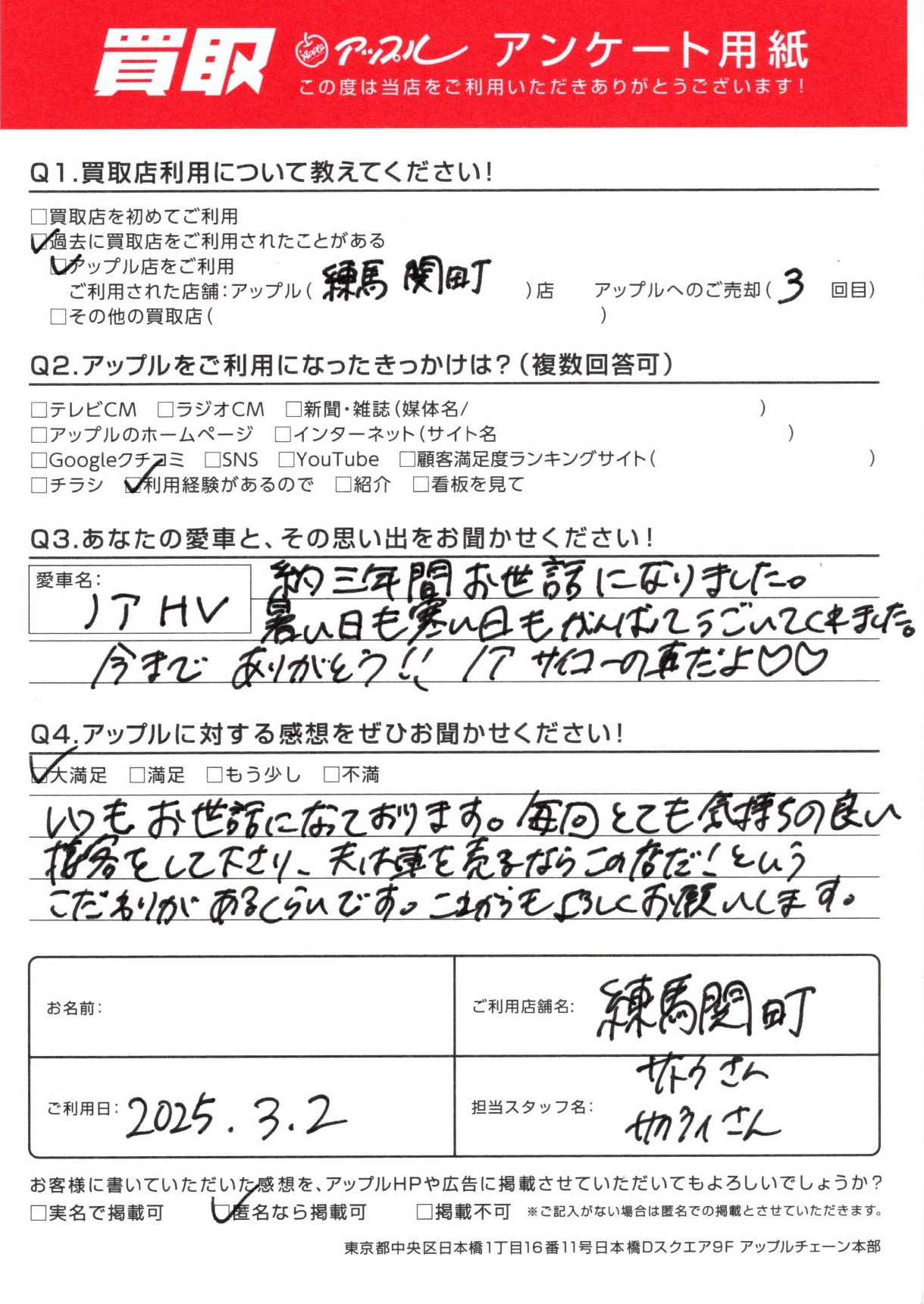お車:ノアHV Q.愛車との思い出は?約三年間お世話になりました。暑い日も寒い日もがんばってうごいてくれました。今までありがとう!!ノアサイコーの車だよ♡♡ Q.アップルの感想は?A.大満足:いつもお世話になっております。毎回とても気持ちの良い接客をして下さり、夫は車を売るならこの店だ!というこだわりがあるくらいです。これからもよろしくお願いします。