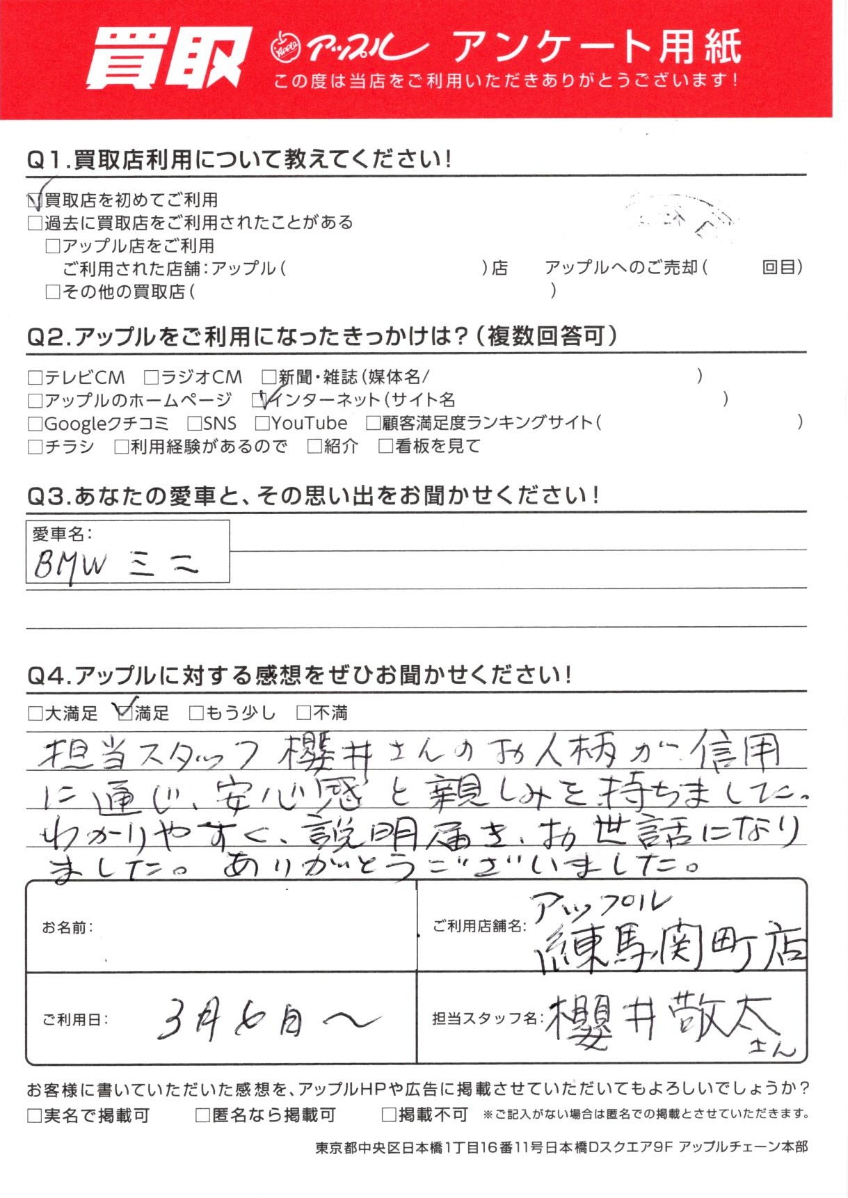 お車のご相談・ 査定だけでもOK! カンタン 入力 30秒 アップルがブランド買取始めました! お電話でも受付中! 受付時間10:00 ~ 19:00 03-5903-8567 お車のご相談・ 査定だけでもOK! カンタン 入力 30秒 アップルがブランド買取始めました! お電話でも受付中! 受付時間10:00 ~ 19:00 03-5903-8567 アップルがブランド買取始めました! お電話でも受付中! 受付時間10:00 ~ 19:00 03-5903-8567 店舗情報 在庫車 スタッフ紹介 ブログ お客様の声 キャンペーン お得 無料査定 click お客様の声 ご記入日: 2025/03/06 練馬区 O・H様 車名:ミニ ミニ お車:BMWミニ Q.愛車との思い出は? Q.アップルの感想は?A.満足:担当スタッフ櫻井さんのお人柄が信用に通じ安心感と親しみを持ちました。わかりやすく説明届き、お世話になりました。ありがとうございました。 前へ 次へ お客様の声一覧を見る
