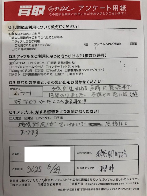 お車のご相談・ 査定だけでもOK! カンタン 入力 30秒 アップルがブランド買取始めました! お電話でも受付中! 受付時間10:00 ~ 19:00 03-5903-8567 お車のご相談・ 査定だけでもOK! カンタン 入力 30秒 アップルがブランド買取始めました! お電話でも受付中! 受付時間10:00 ~ 19:00 03-5903-8567 アップルがブランド買取始めました! お電話でも受付中! 受付時間10:00 ~ 19:00 03-5903-8567 店舗情報 在庫車 スタッフ紹介 ブログ お客様の声 キャンペーン お得 無料査定 click お客様の声 ご記入日: 2025/06/29 杉並区 K・N様 車名:日産 ムラーノ お車:ムラーノ Q.愛車との思い出は?子供が産まれる直前に買った車で、13年乗りました。子供との思い出(旅行など)がたくさんある車です。 Q.アップルの感想は?A.満足:接客対応が丁寧で感謝しております。 前へ 次へ お客様の声一覧を見る