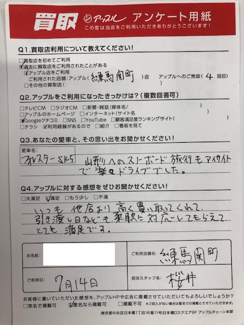 お車のご相談・ 査定だけでもOK! カンタン 入力 30秒 アップルがブランド買取始めました! お電話でも受付中! 受付時間10:00 ~ 19:00 03-5903-8567 お車のご相談・ 査定だけでもOK! カンタン 入力 30秒 アップルがブランド買取始めました! お電話でも受付中! 受付時間10:00 ~ 19:00 03-5903-8567 アップルがブランド買取始めました! お電話でも受付中! 受付時間10:00 ~ 19:00 03-5903-8567 店舗情報 在庫車 スタッフ紹介 ブログ お客様の声 キャンペーン お得 無料査定 click お客様の声 ご記入日: 2025/07/14 西東京市 S・S様 車名:スバル フォレスター お車:フォレスター Q.愛車との思い出は?山形へのスノーボード旅行もアイサイトで楽々ドライブでした。 Q.アップルの感想は?A.満足:いつも他店より高く買い取ってくれて、引き渡し日なども柔軟に対応してもらえて、とても満足です。 前へ 次へ お客様の声一覧を見る