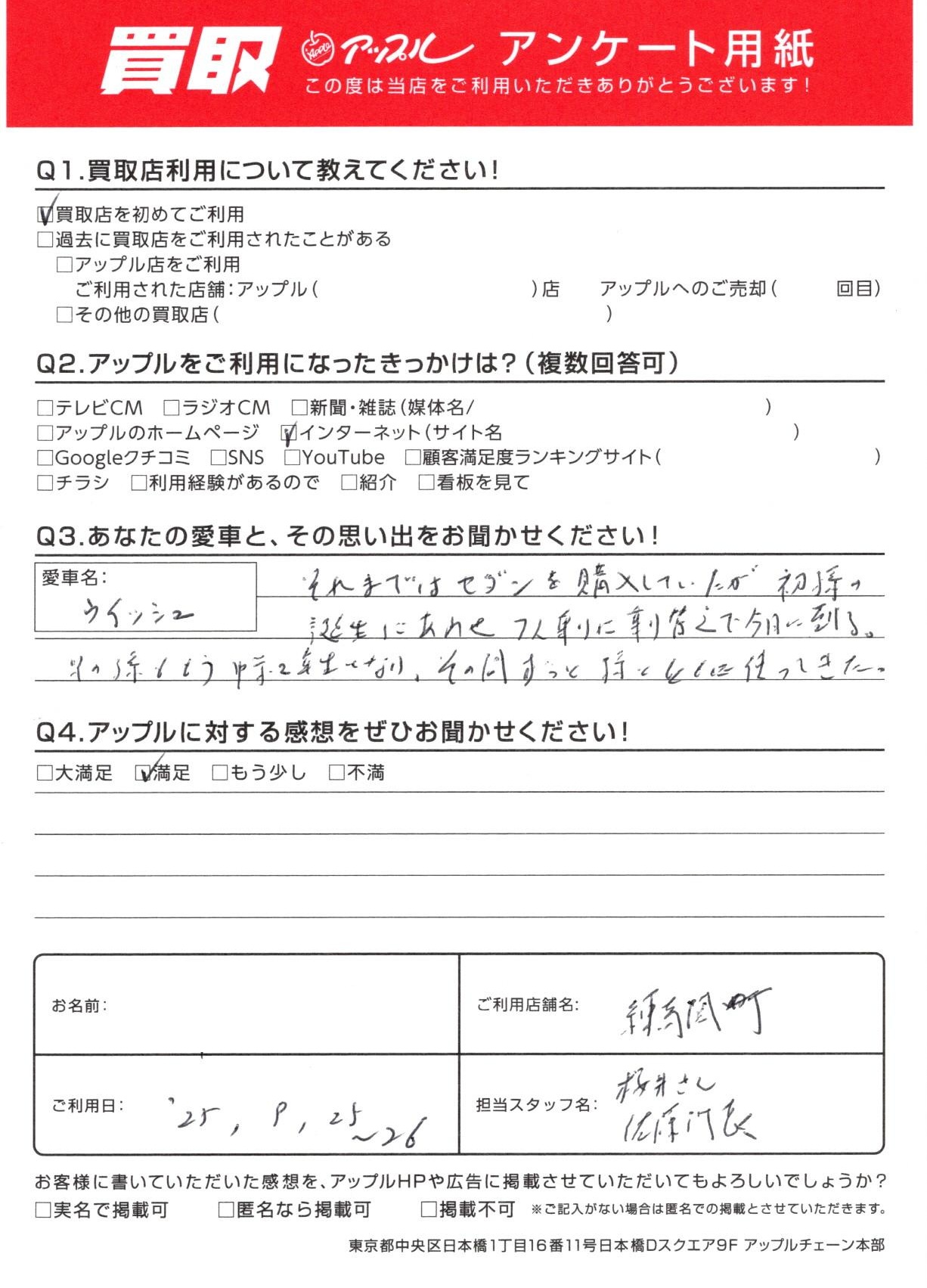お車:ウィッシュ Q.愛車との思い出は?それまではセダンを購入していたが、初孫の誕生にあわせ7人乗りに乗り替えで今日に到る。その孫ももう中学2年生となり、その間ずっと孫とともに使ってきた。 Q.アップルの感想は?A.満足