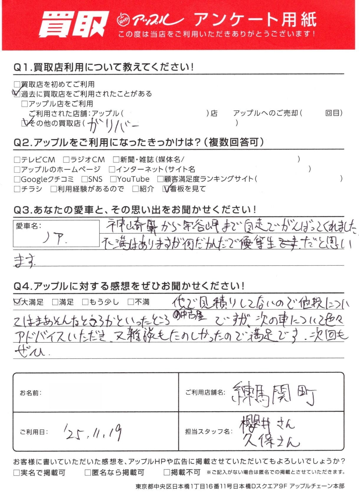 お車:ノア Q.愛車との思い出は?神崎鼻から宗谷岬まで自走でがんばってくれました。不満はありますが何だかんだで優等生だと思います。 Q.アップルの感想は?A.大満足:他の中古屋で見積りしてないので値段についてはまあそんなところかといったところですが、次の車についていろいろアドバイスいただき、又雑談もたのしかったので満足です。次回もぜひ。