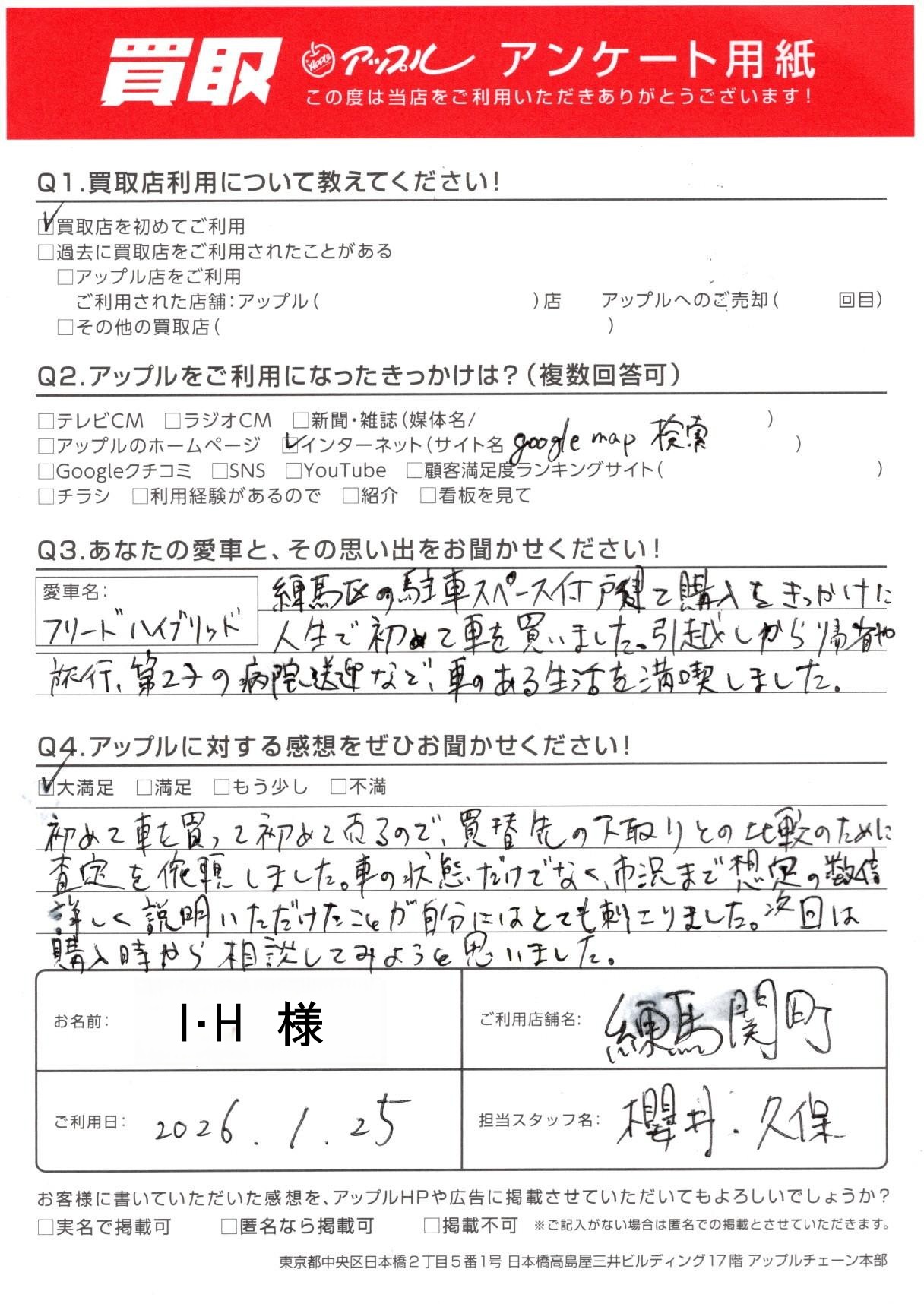 お車:フリードハイブリッド Q.愛車との思い出は?練馬区の駐車スペース付戸建て購入をきっかけに人生で初めて車を買いました。引越しから帰省や旅行、第2子の病院送迎など、車のある生活を満喫しました。 Q.アップルの感想は?A.大満足:初めて車を買って初めて売るので、買替先の下取りとの比較のために査定を依頼しました。車の状態だけでなく、市況まで想定の数倍詳しく説明いただけたことが自分にはとても刺さりました。次回は購入時から相談してみようと思いました。