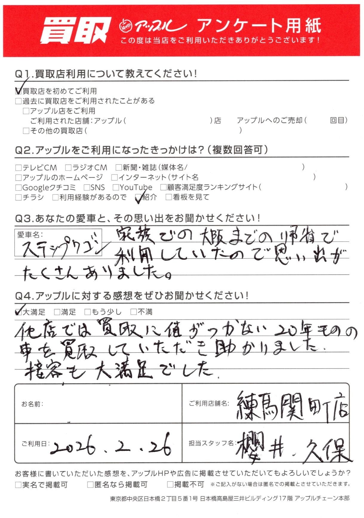 お車のご相談・ 査定だけでもOK! カンタン 入力 30秒 アップルがブランド買取始めました! お電話でも受付中! 受付時間10:00 ~ 19:00 03-5903-8567 お車のご相談・ 査定だけでもOK! カンタン 入力 30秒 アップルがブランド買取始めました! お電話でも受付中! 受付時間10:00 ~ 19:00 03-5903-8567 アップルがブランド買取始めました! お電話でも受付中! 受付時間10:00 ~ 19:00 03-5903-8567 店舗情報 在庫車 スタッフ紹介 ブログ お客様の声 キャンペーン お得 無料査定 click お客様の声 ご記入日: 2026/02/26 練馬区 S・T様 車名:ホンダ ステップワゴン お車:ステップワゴン Q.愛車との思い出は?家族での大阪までの帰省で利用していたので思い出がたくさんありました。 Q.アップルの感想は?A.大満足:他店では買取に値がつかない20年ものの車を買取していただき助かりました。接客も大満足でした。 前へ 次へ お客様の声一覧を見る
