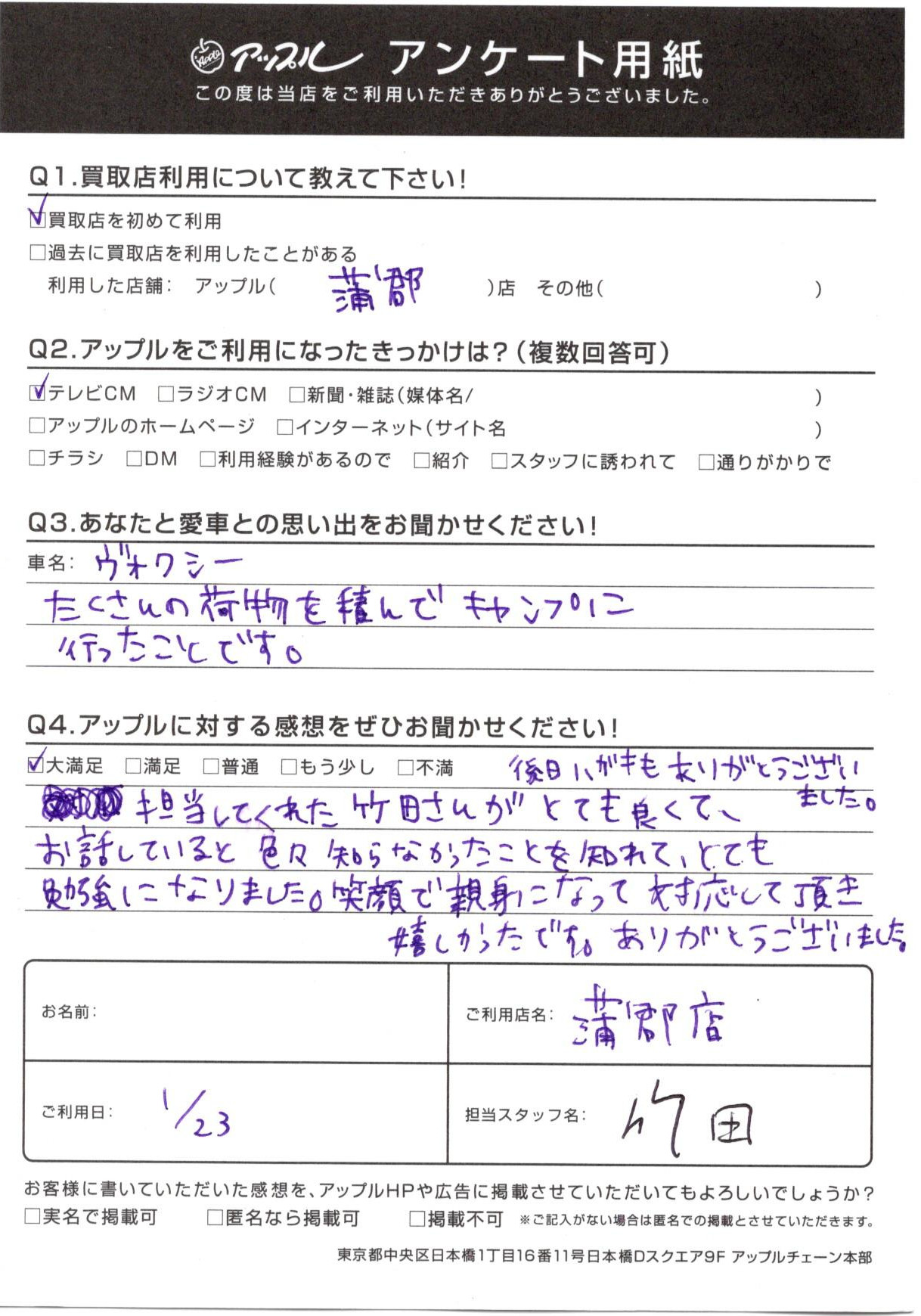お車のご相談・ 査定だけでもOK! カンタン 入力 30秒 アップルがブランド買取始めました! お電話でも受付中! 受付時間10:00 ~ 19:00(新規ご査定の受付は18:30までとなります。) 0533-66-6666 お車のご相談・ 査定だけでもOK! カンタン 入力 30秒 アップルがブランド買取始めました! お電話でも受付中! 受付時間10:00 ~ 19:00(新規ご査定の受付は18:30までとなります。) 0533-66-6666 アップルがブランド買取始めました! お電話でも受付中! 受付時間10:00 ~ 19:00(新規ご査定の受付は18:30までとなります。) 0533-66-6666 店舗情報 在庫車 スタッフ紹介 ブログ お客様の声 キャンペーン お得 無料査定 click お客様の声 ご記入日: 2021/01/23 愛知県 匿名希望様 車名:トヨタ ヴォクシー 担当してくれた竹田さんがとても良くて、お話ししていると色々知らなかったことを知れて、とても勉強になりました。笑顔で親切になって対応して頂き、嬉しかったです。ありがとうございました。後日ハガキもありがとうございました。 前へ 次へ お客様の声一覧を見る