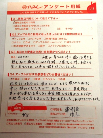 担当していただいた清水さんがとても親切に明るく楽しく接してくださったので、気持ちよくて、査定額は車がボロ車だった事もあり、希望額にならなかったのですが、不快感なく店をあとにする事が出来ました。