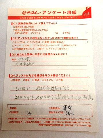 お車のご相談・ 査定だけでもOK! カンタン 入力 30秒 アップルがブランド買取始めました! お電話でも受付中! 受付時間10:00 ~ 19:00(新規ご査定の受付は18:30までとなります。) 0533-66-6666 お車のご相談・ 査定だけでもOK! カンタン 入力 30秒 アップルがブランド買取始めました! お電話でも受付中! 受付時間10:00 ~ 19:00(新規ご査定の受付は18:30までとなります。) 0533-66-6666 アップルがブランド買取始めました! お電話でも受付中! 受付時間10:00 ~ 19:00(新規ご査定の受付は18:30までとなります。) 0533-66-6666 店舗情報 在庫車 スタッフ紹介 ブログ お客様の声 キャンペーン お得 無料査定 click お客様の声 ご記入日: 2014/03/15 匿名希望様 *お車との思い出・・・今の職場と*アップルをご利用いただいての感想・・・ていねい、親切な対応でした。初めてでもわかりやすく説明してくれました。担当者より・・・先日はありがとうございました。次もサーフでご利用くださいね。 前へ 次へ お客様の声一覧を見る