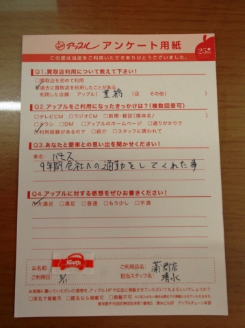 お車のご相談・ 査定だけでもOK! カンタン 入力 30秒 アップルがブランド買取始めました! お電話でも受付中! 受付時間10:00 ~ 19:00(新規ご査定の受付は18:30までとなります。) 0533-66-6666 お車のご相談・ 査定だけでもOK! カンタン 入力 30秒 アップルがブランド買取始めました! お電話でも受付中! 受付時間10:00 ~ 19:00(新規ご査定の受付は18:30までとなります。) 0533-66-6666 アップルがブランド買取始めました! お電話でも受付中! 受付時間10:00 ~ 19:00(新規ご査定の受付は18:30までとなります。) 0533-66-6666 店舗情報 在庫車 スタッフ紹介 ブログ お客様の声 キャンペーン お得 無料査定 click お客様の声 ご記入日: 2014/05/11 K.T様 *愛車との思い出・・・・バモス 9年間会社への通勤をしてくれた事*担当者より・・・・とても大事にのられてきたお車でしたよね。次のお車も同じように大事に乗ってくださいねぇ(^▽^) 前へ 次へ お客様の声一覧を見る