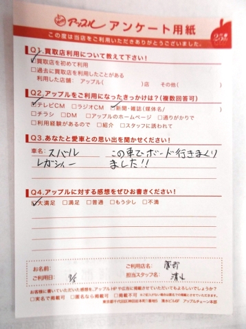 お車のご相談・ 査定だけでもOK! カンタン 入力 30秒 アップルがブランド買取始めました! お電話でも受付中! 受付時間10:00 ~ 19:00(新規ご査定の受付は18:30までとなります。) 0533-66-6666 お車のご相談・ 査定だけでもOK! カンタン 入力 30秒 アップルがブランド買取始めました! お電話でも受付中! 受付時間10:00 ~ 19:00(新規ご査定の受付は18:30までとなります。) 0533-66-6666 アップルがブランド買取始めました! お電話でも受付中! 受付時間10:00 ~ 19:00(新規ご査定の受付は18:30までとなります。) 0533-66-6666 店舗情報 在庫車 スタッフ紹介 ブログ お客様の声 キャンペーン お得 無料査定 click お客様の声 ご記入日: 2014/07/05 匿名様 *おクルマとの思い出・・・・スバル レガシィこの車でボード行きまくりました!!*担当者より・・・・お兄様からおクルマは譲ってもらえたのでしょうか?大事に乗られていらっしゃったので手放すのはもったいないとは思いますが・・・・またいつでも遊びにお越しください♪ 前へ 次へ お客様の声一覧を見る
