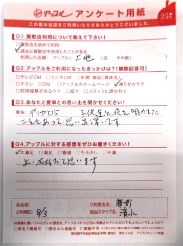 お車のご相談・ 査定だけでもOK! カンタン 入力 30秒 アップルがブランド買取始めました! お電話でも受付中! 受付時間10:00 ~ 19:00(新規ご査定の受付は18:30までとなります。) 0533-66-6666 お車のご相談・ 査定だけでもOK! カンタン 入力 30秒 アップルがブランド買取始めました! お電話でも受付中! 受付時間10:00 ~ 19:00(新規ご査定の受付は18:30までとなります。) 0533-66-6666 アップルがブランド買取始めました! お電話でも受付中! 受付時間10:00 ~ 19:00(新規ご査定の受付は18:30までとなります。) 0533-66-6666 店舗情報 在庫車 スタッフ紹介 ブログ お客様の声 キャンペーン お得 無料査定 click お客様の声 ご記入日: 2014/08/03 匿名希望様 おクルマとの思い出・・・・デリカD:5 子供達と夜を明かしたこともあって思い出深いです。アップルをご利用いただいての感想・・・・よい対応だと思います。担当者より・・・・思い出のおクルマをありがとうございました!!また次回もお待ちしてますよぉ~♪ 前へ 次へ お客様の声一覧を見る