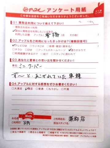 お車のご相談・ 査定だけでもOK! カンタン 入力 30秒 アップルがブランド買取始めました! お電話でも受付中! 受付時間10:00 ~ 19:00(新規ご査定の受付は18:30までとなります。) 0533-66-6666 お車のご相談・ 査定だけでもOK! カンタン 入力 30秒 アップルがブランド買取始めました! お電話でも受付中! 受付時間10:00 ~ 19:00(新規ご査定の受付は18:30までとなります。) 0533-66-6666 アップルがブランド買取始めました! お電話でも受付中! 受付時間10:00 ~ 19:00(新規ご査定の受付は18:30までとなります。) 0533-66-6666 店舗情報 在庫車 スタッフ紹介 ブログ お客様の声 キャンペーン お得 無料査定 click お客様の声 ご記入日: 2014/08/01 A.A様 愛車との思い出・・・ず~と、あこがれていた車種担当者より・・・大切なおクルマをご査定させていただき大変嬉しいです。またのご利用を心からお待ちしております。 前へ 次へ お客様の声一覧を見る