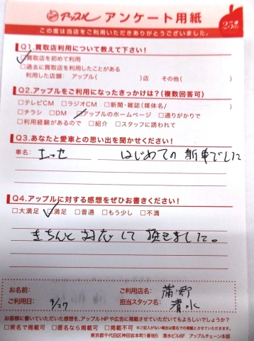 お車のご相談・ 査定だけでもOK! カンタン 入力 30秒 アップルがブランド買取始めました! お電話でも受付中! 受付時間10:00 ~ 19:00(新規ご査定の受付は18:30までとなります。) 0533-66-6666 お車のご相談・ 査定だけでもOK! カンタン 入力 30秒 アップルがブランド買取始めました! お電話でも受付中! 受付時間10:00 ~ 19:00(新規ご査定の受付は18:30までとなります。) 0533-66-6666 アップルがブランド買取始めました! お電話でも受付中! 受付時間10:00 ~ 19:00(新規ご査定の受付は18:30までとなります。) 0533-66-6666 店舗情報 在庫車 スタッフ紹介 ブログ お客様の声 キャンペーン お得 無料査定 click お客様の声 ご記入日: 2014/09/27 匿名希望様 愛車との思い出・・・・エッセはじめての新車でした。アップルへの感想・・・・きちんと対応して頂きました。担当者より・・・・先日はご来店ありがとうございました。また次のおクルマも見せてくださいね♪ご家族にもよろしくお伝えください。 前へ 次へ お客様の声一覧を見る