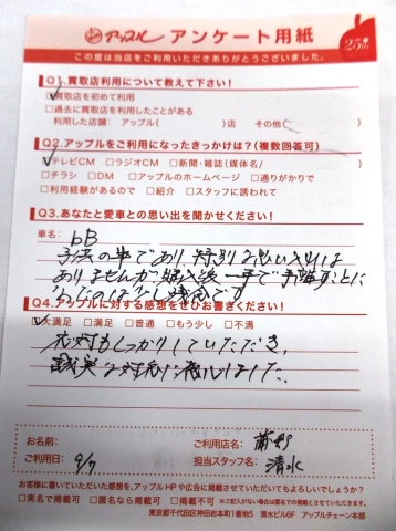 お子様のおクルマを査定させていただきありがとうございました。