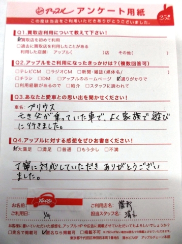 お車のご相談・ 査定だけでもOK! カンタン 入力 30秒 アップルがブランド買取始めました! お電話でも受付中! 受付時間10:00 ~ 19:00(新規ご査定の受付は18:30までとなります。) 0533-66-6666 お車のご相談・ 査定だけでもOK! カンタン 入力 30秒 アップルがブランド買取始めました! お電話でも受付中! 受付時間10:00 ~ 19:00(新規ご査定の受付は18:30までとなります。) 0533-66-6666 アップルがブランド買取始めました! お電話でも受付中! 受付時間10:00 ~ 19:00(新規ご査定の受付は18:30までとなります。) 0533-66-6666 店舗情報 在庫車 スタッフ紹介 ブログ お客様の声 キャンペーン お得 無料査定 click お客様の声 ご記入日: 2015/01/04 O様 愛車との思い出・・・プリウス亡き父が乗っていた車で、よく家族で遊びに行きました。アップルへの感想・・・丁寧に対応していただきありがとうございました。担当者より・・・大切なお車をお譲りいただきありがとうございました。また別のお車でご利用お待ちしております♪ 前へ 次へ お客様の声一覧を見る