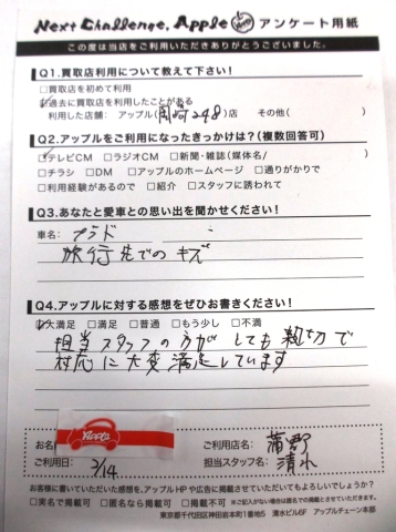 お車のご相談・ 査定だけでもOK! カンタン 入力 30秒 アップルがブランド買取始めました! お電話でも受付中! 受付時間10:00 ~ 19:00(新規ご査定の受付は18:30までとなります。) 0533-66-6666 お車のご相談・ 査定だけでもOK! カンタン 入力 30秒 アップルがブランド買取始めました! お電話でも受付中! 受付時間10:00 ~ 19:00(新規ご査定の受付は18:30までとなります。) 0533-66-6666 アップルがブランド買取始めました! お電話でも受付中! 受付時間10:00 ~ 19:00(新規ご査定の受付は18:30までとなります。) 0533-66-6666 店舗情報 在庫車 スタッフ紹介 ブログ お客様の声 キャンペーン お得 無料査定 click お客様の声 ご記入日: 2015/02/14 I様 愛車との思い出・・・プラド旅行先でのキズアップルへの感想・・・担当スタッフの方がとても親切で対応に大変満足しています。担当者より・・・・まさかの再会でしたね!!またいつでも遊びに来てくださいね♪ 前へ 次へ お客様の声一覧を見る