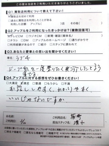 お車のご相談・ 査定だけでもOK! カンタン 入力 30秒 アップルがブランド買取始めました! お電話でも受付中! 受付時間10:00 ~ 19:00(新規ご査定の受付は18:30までとなります。) 0533-66-6666 お車のご相談・ 査定だけでもOK! カンタン 入力 30秒 アップルがブランド買取始めました! お電話でも受付中! 受付時間10:00 ~ 19:00(新規ご査定の受付は18:30までとなります。) 0533-66-6666 アップルがブランド買取始めました! お電話でも受付中! 受付時間10:00 ~ 19:00(新規ご査定の受付は18:30までとなります。) 0533-66-6666 店舗情報 在庫車 スタッフ紹介 ブログ お客様の声 キャンペーン お得 無料査定 click お客様の声 ご記入日: 2015/03/10 匿名希望様 愛車との思い出・・・ラブ4ジープ系を一度乗りたくてこう入したと言う事です。アップルへの感想・・・・お話ししやすく、わかりやすくいいじゃにですか。担当者より・・・・大切に乗られてきたお車でしたね。次のおクルマはもう決まりましたか?またいつでもお越しくださいね♪ 前へ 次へ お客様の声一覧を見る