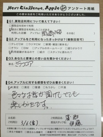お車のご相談・ 査定だけでもOK! カンタン 入力 30秒 アップルがブランド買取始めました! お電話でも受付中! 受付時間10:00 ~ 19:00(新規ご査定の受付は18:30までとなります。) 0533-66-6666 お車のご相談・ 査定だけでもOK! カンタン 入力 30秒 アップルがブランド買取始めました! お電話でも受付中! 受付時間10:00 ~ 19:00(新規ご査定の受付は18:30までとなります。) 0533-66-6666 アップルがブランド買取始めました! お電話でも受付中! 受付時間10:00 ~ 19:00(新規ご査定の受付は18:30までとなります。) 0533-66-6666 店舗情報 在庫車 スタッフ紹介 ブログ お客様の声 キャンペーン お得 無料査定 click お客様の声 ご記入日: 2015/03/06 匿名希望様 愛車との思いで・・・ミラココアアップルへの感想・・・色々なお話が聞けてとても楽しかったです。担当者より・・・ありがとうございました!お車非常にきれいでしたしまだまだお乗りになって頂いただけたらと思います!またお手放しになられる際にはお声かけください! 前へ 次へ お客様の声一覧を見る