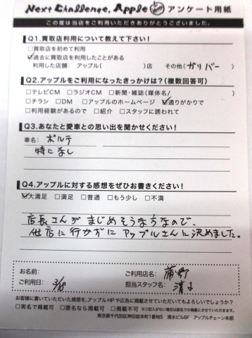 お車のご相談・ 査定だけでもOK! カンタン 入力 30秒 アップルがブランド買取始めました! お電話でも受付中! 受付時間10:00 ~ 19:00(新規ご査定の受付は18:30までとなります。) 0533-66-6666 お車のご相談・ 査定だけでもOK! カンタン 入力 30秒 アップルがブランド買取始めました! お電話でも受付中! 受付時間10:00 ~ 19:00(新規ご査定の受付は18:30までとなります。) 0533-66-6666 アップルがブランド買取始めました! お電話でも受付中! 受付時間10:00 ~ 19:00(新規ご査定の受付は18:30までとなります。) 0533-66-6666 店舗情報 在庫車 スタッフ紹介 ブログ お客様の声 キャンペーン お得 無料査定 click お客様の声 ご記入日: 2015/03/18 匿名希望様 アップルへの感想・・・店長さんがまじめそうな方なので他店に行かずにアップルさんに決めました。担当者より・・・すぐに決めて頂いてありがとうございました!!次は今乗られているスポーツカーをお願いします。 前へ 次へ お客様の声一覧を見る