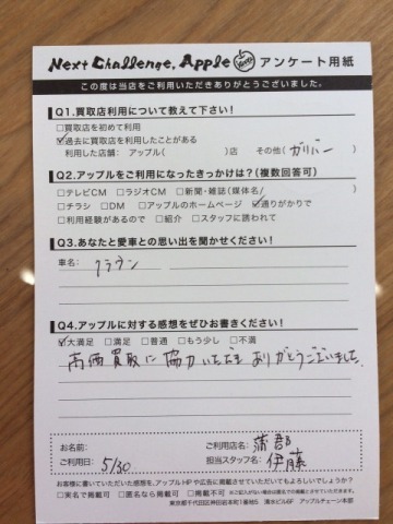 お車のご相談・ 査定だけでもOK! カンタン 入力 30秒 アップルがブランド買取始めました! お電話でも受付中! 受付時間10:00 ~ 19:00(新規ご査定の受付は18:30までとなります。) 0533-66-6666 お車のご相談・ 査定だけでもOK! カンタン 入力 30秒 アップルがブランド買取始めました! お電話でも受付中! 受付時間10:00 ~ 19:00(新規ご査定の受付は18:30までとなります。) 0533-66-6666 アップルがブランド買取始めました! お電話でも受付中! 受付時間10:00 ~ 19:00(新規ご査定の受付は18:30までとなります。) 0533-66-6666 店舗情報 在庫車 スタッフ紹介 ブログ お客様の声 キャンペーン お得 無料査定 click お客様の声 ご記入日: 2015/05/24 匿名希望様 愛車との思いで・・・クラウンアップルに対する感想・・・高価買取に協力頂きありがとうございました。担当者より・・・かっこよくてきれいで・・・これぞクラウン!といった感じのお車でした!またぜひご利用いただけたらと思います!よろしくお願いいたします! 前へ 次へ お客様の声一覧を見る