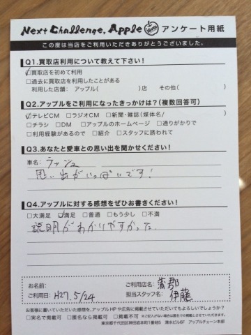 お車のご相談・ 査定だけでもOK! カンタン 入力 30秒 アップルがブランド買取始めました! お電話でも受付中! 受付時間10:00 ~ 19:00(新規ご査定の受付は18:30までとなります。) 0533-66-6666 お車のご相談・ 査定だけでもOK! カンタン 入力 30秒 アップルがブランド買取始めました! お電話でも受付中! 受付時間10:00 ~ 19:00(新規ご査定の受付は18:30までとなります。) 0533-66-6666 アップルがブランド買取始めました! お電話でも受付中! 受付時間10:00 ~ 19:00(新規ご査定の受付は18:30までとなります。) 0533-66-6666 店舗情報 在庫車 スタッフ紹介 ブログ お客様の声 キャンペーン お得 無料査定 click お客様の声 ご記入日: 2015/05/24 匿名希望様 愛車との思いで・・・ラッシュ思い出がいっぱいです!アップルに対する感想・・・説明がわかりやすかった担当者より・・・ありがとうございます!これからもさらに分かりやすく!そして楽しいお時間を提供できるように頑張りますね!またお願いいたします! 前へ 次へ お客様の声一覧を見る